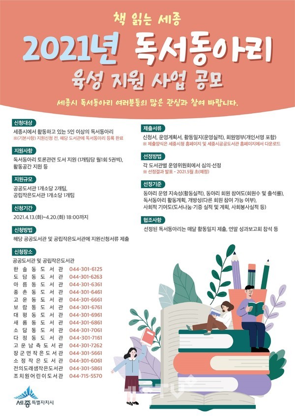 세종특별자치시(시장 이춘희)가 지역 내 독서에 대한 관심을 높이고, 독서활동 확산을 위해 2021년 독서동아리를 선정하고 지원에 나선다.