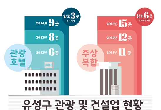 26일 유성구에 따르면 유성지역의 관광호텔은 지난 2012년 6곳에서 지난해 8곳, 올해는 9곳으로 늘었다. 2000년부터(리베라 2006년 재개장 제외) 호텔 조성이 전혀 없다가 지난해 이후 조성이 증가했다는 점에서 지역 관광업계는 고무적이다.