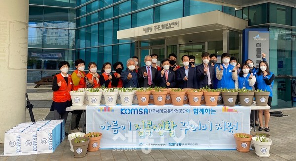 이날 아름동 지역사회보장협의체는 한국해양교통안전공단과 대파 기르기, 건강식품, 운동기구 등으로 구성된 아름이 집콕 꾸러미를 취약계층 20가구에 전달했다.