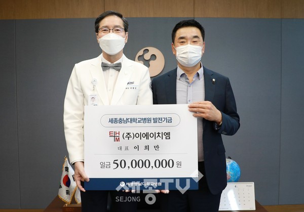 세종충남대학교병원(원장 나용길)은 4월 13일(화) ㈜이에이치엠(EHM) 이희만 대표로부터 발전후원금 5000만원을 기부받았다고 밝혔다.