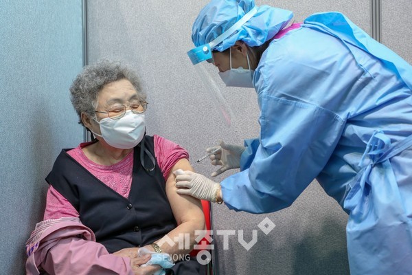 충남 당진시는 15일 코로나19 예방접종센터(송악문화스포츠센터)에서 사전 접종에 동의한 75세 이상 어르신을 대상으로 화이자 백신 접종을 시작했다. 저작권자 © SJB세종TV 무단전재 및 재배포 금지 이사렬 기자 다른기사 보기 페이스북 트위터 카카오톡 네이버블로그 구글+ URL복사 기사공유하기