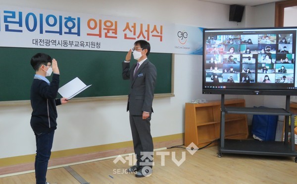 어린이의사당을 운영하고 있는 대전대흥초가 온라인(Zoom) 회의방을 개설하고, 동부 초등학교 학생 대표 72명이 참여하여 온라인 선서식을 실시하였다. 대전대흥초 학교장 인사말씀을 시작으로, 선서문 낭독, 동부어린이의회 배지 수여,대전선거관리위원회 강사의 민주시민 역량 강화 특강 순으로 선서식을 진행하였다.