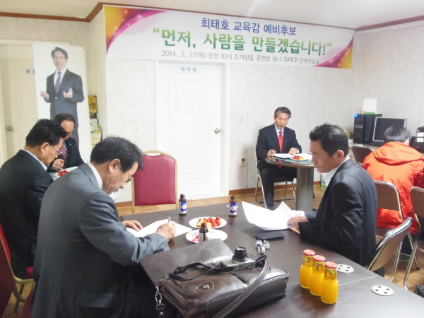 2014년 3월 중하순경 조치원의 음식점에서 삼락회 모임이 있었습니다. 퇴직 교장선생님들과, 교육감 예비후보 1명 등이 모인 자리였습니다. 그 자리에서 다른 후보를 지지하는 모 前 교장께서 최태호 예비후보의 부인이 전교조라는 이야기를 하였습니다. 본인의 아내는 부임 초부터 퇴직까지 교총 회원과 임원을 역임한 순수 보수 진영의 사람입니다. 보수 인사들이 모인 자리에서 전교조라고 칭한 것은, 저 최태호 교육감예비후보를 비방한 명백한 명예훼손이고 허위사실 유포입니다.