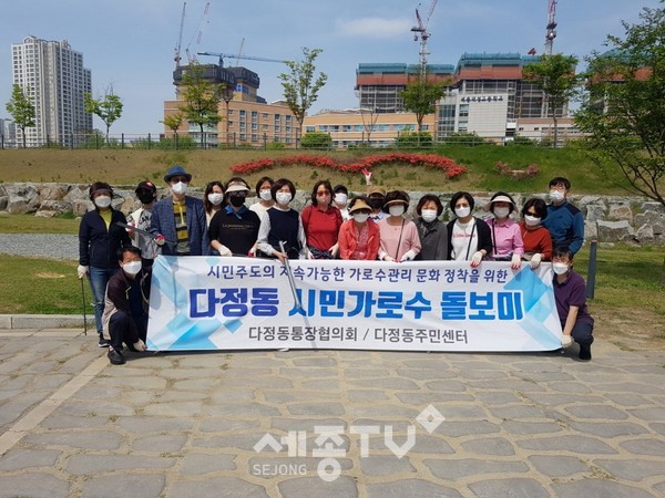 세종특별자치시 다정동 통장협의회(회장 김성호)가 지난 21일 다정동 품안뜰공원 일대에서 ‘시민 가로수돌보미 활동’을 펼쳤다.