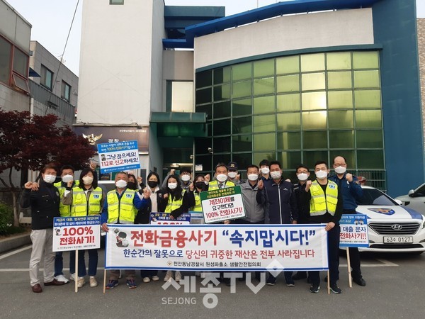 천안동남경찰서 원성파출소(소장 경감 이돈섭)는, 지난 4. 19.(月)부터 같은 달 22.(木)까지 18:00경부터 원성파출소 생활안전협의회와 함께 천안시 동남구 원성동 소재 교보사거리에서 전화금융사기 예방을 위한 캠페인 활동을 펼쳤다.