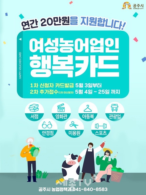 공주시(시장 김정섭)가 여성농어업인의 문화‧복지 생활 영위와 삶의 질 향상에 도모하기 위해 ‘여성농어업인 행복바우처’ 카드 발급을 5월 3일부터 시작한다.