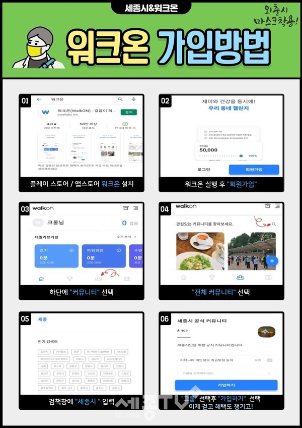 세종특별자치시보건소(소장 권근용)가 모바일 앱 ‘워크온’을 활용해 ‘5∼6월 30만보 걷기 챌린지’를 운영한다고 3일 밝혔다.