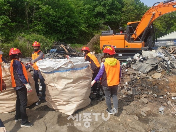 이 현장은 지난 4월 화재피해를 겪고 전소된 곳으로 이날 장군면 남‧여의용소방대원 18명은 굴착기를 동원해 화재 피해 잔존물을 제거하고 청소 등을 벌였다.