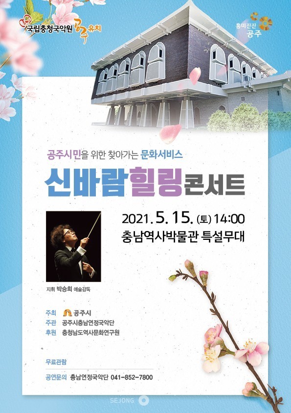이번 연주회는 코로나 19 방역수칙을 철저히 준수해 진행될 예정으로, 자세한 문의 및 신청은 공주시충남연정국악단(041-852-7800)으로 하면 된다.