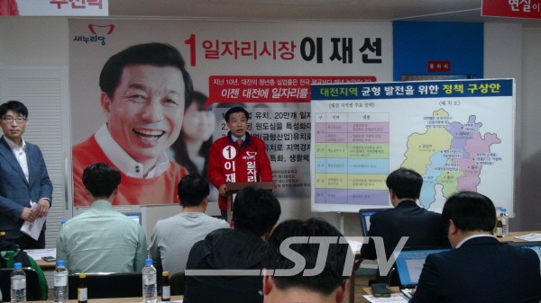 이재선 후보는 이날 오전 자신의 선거사무소에서 기자회견을 열고 지역 경제 활성화와 일자리 창출 방안으로 ▲금형산업 등 첨단뿌리 산업단지 육성(동구 하소동 산업단지) ▲국제 전문 직업학교(중구 옛 충남도청 부지) ▲의료복합단지로 육성(서구 평촌 산업단지) ▲로봇 자동차, 메디바이오 등 관련 대기업 유치(유성구 둔곡지구) ▲테마파크 유치(대덕구 연축동) 등 대전 5개 자치구에 대한 정책 구상을 제시했다.
