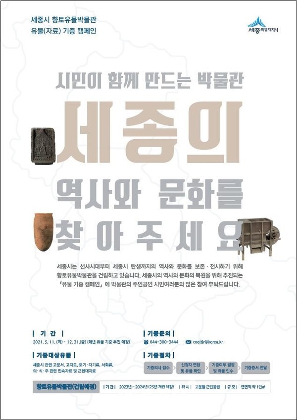 기증 대상은 선사시대부터 근현대까지 세종시 관련 유물·자료 일체로 고문서, 고지도, 토기·자기류, 서화류, 미술·공예품, 민속자료 등이며 개인·단체 누구나 참여할 수 있다.