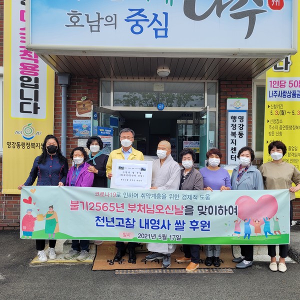 부처님 오신 날 이웃주민들을 희망과 용기를 주기위해 사랑나눔 쌀 100포(영강동 50포, 다시면 50포)를 전달했다.