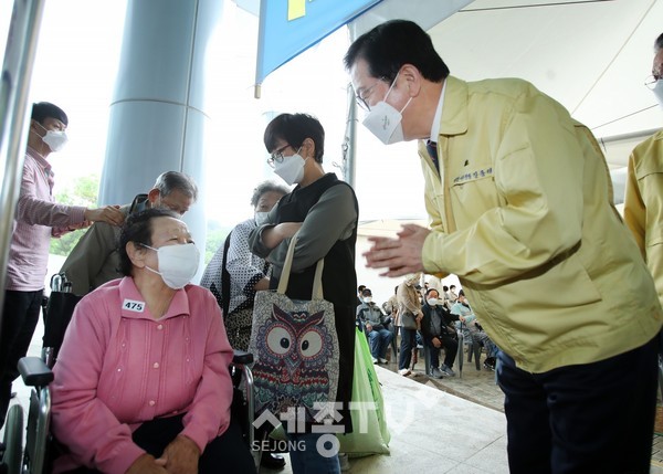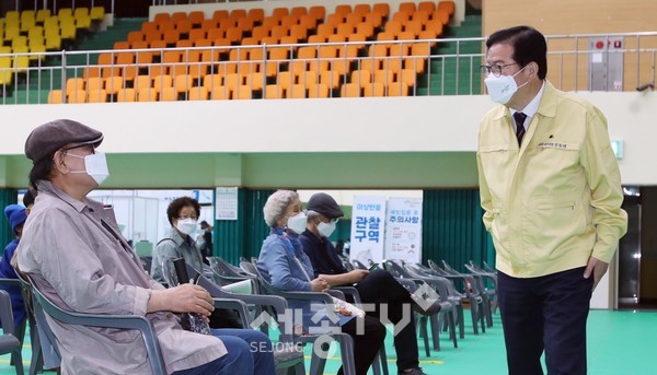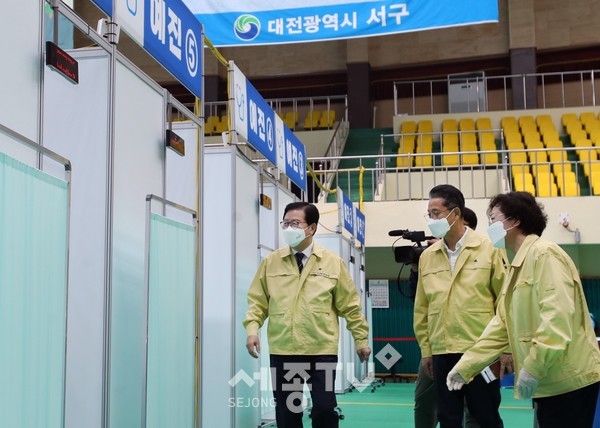 장종태 대전 서구청장은 20일 코로나19 예방접종센터인 도솔다목적체육관을 찾아 현장을 꼼꼼히 점검하고, 의료진과 자원봉사자 등 센터 운영 요원을 격려했다.