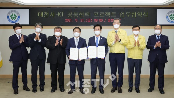 허태정 대전시장과 구현모 KT 대표이사는 21일 대전시청에서 ‘공동협력 프로젝트 업무협약’을 체결했다.