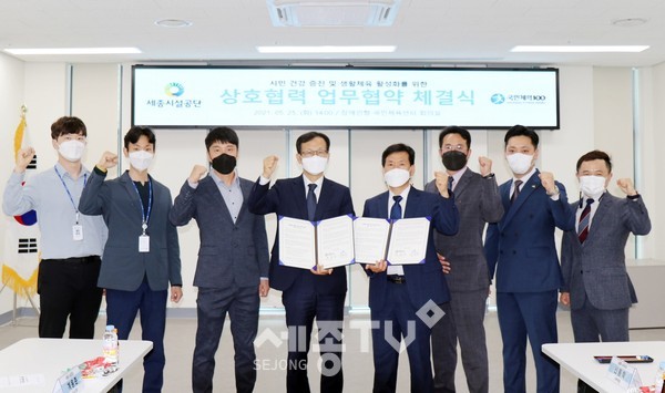 세종특별자치시체육회(회장 정태봉) 국민체력100 세종체력인증센터와 세종시설관리공단(이사장 계용준)이 지난 25일 업무협약을 체결하고, 세종시민 생활체육활성화와 체력증진을 위해 상호 협력하기로 했다.