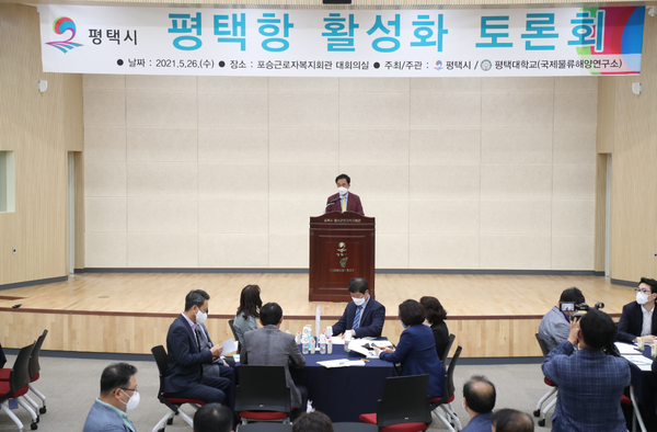 평택시 정장선 시장은 26일 평택 포승근로자복지회관에서 평택항 발전방향과 현안사항에 대한 대응전략 수립을 위해 산・관・학이 함께하는 토론의 장을 마련했다.