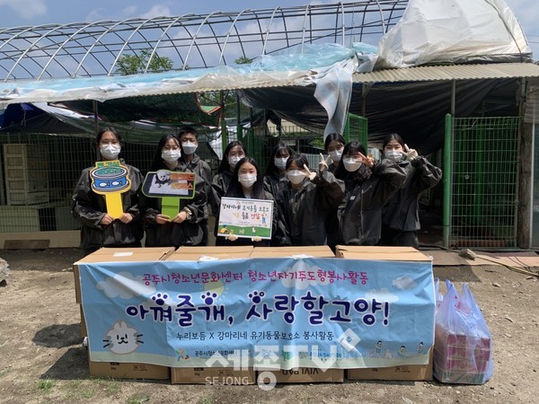 공주시청소년문화센터(관장 이미경)는 최근 소속 청소년동아리 누리보듬에서 청소년 자기주도형 봉사활동으로 금산유기동물보호소 강마리네를 방문해 유기동물들에게 필요한 물품 및 간식을 지원했다고 27일 밝혔다.