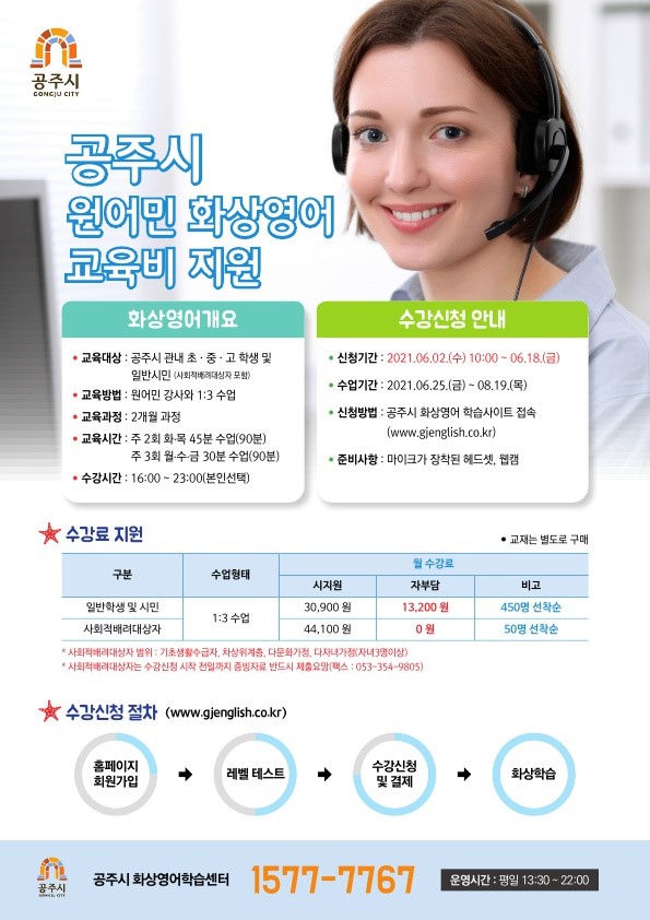 공주시(시장 김정섭)가 올해 처음으로 ‘원어민 화상영어교육’을 시행키로 하고 6월 2일부터 18일까지 1기 수강생을 모집한다.