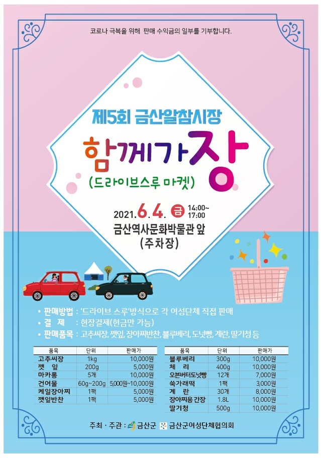 드라이브스루 마켓의 이번 행사는 금산군과 금산군여성단체협의회가 주최 및 주관한다.