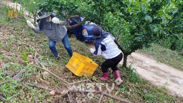 이날 소정면 이장, 직원 등 10명은 한참 수확철을 맞이한 고등리 농가를 방문해 매실수확을 도우며 구슬땀을 흘렸다.