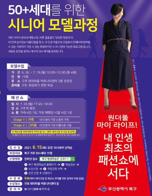 부산 북구(정명희 구청장)는 오는 628일부터 지역주민 50+세대를 대상으로 시니어 모델과정프로그램을 운영한다고 밝혔다.