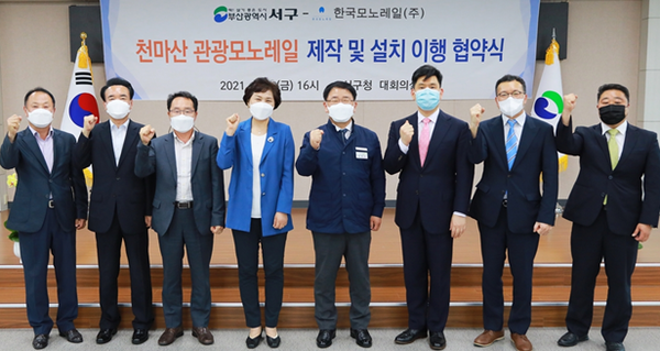 공한수 서구 구청장은 지난 4일 오후 4시 이 사업의 핵심인 관광모노레일 시공 우선협상대상자인 한국모노레일()와 제작 및 설치 협약을 체결했다. 이 자리에는 공한수 구청장과 황종규 한국모노레일 사장 등이 참석했다. 한국모노레일()는 능력과 경험이 풍부한 국내 최고 수준의 모노레일 제작·설치업체로 이날 협약 체결에 따라 곧바로 천마산 관광모노레일(아미배수지~천마바위 간 왕복 3)과 탑승차량 12(8인승 이상) 제작에 착수할 계획이다. 완공 예정일은 내년 12월 말이다.