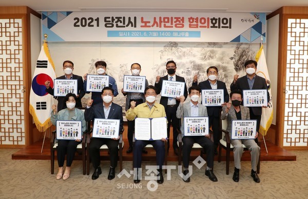 당진시 노사민정 협의회(위원장 김홍장 당진시장)는 지난 7일 시청 해나루홀에서 코로나19 위기로부터 빠른 경제회복과 미래지향적 노사상생 협력관계 구축에 뜻을 모았다.