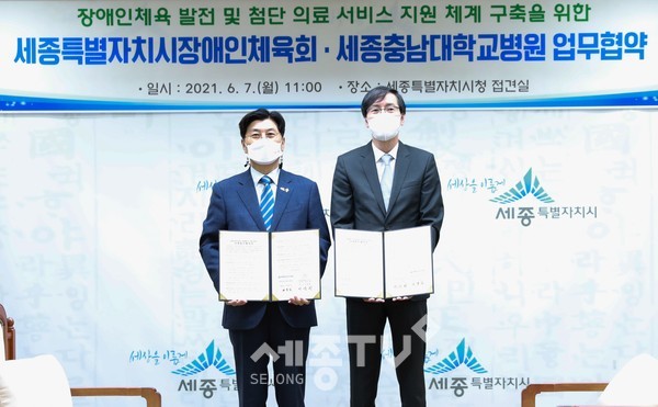 세종충남대학교병원(원장 나용길)은 6월 7일(월) 세종시청 5층 접견실에서 세종시장애인체육회(회장 이춘희·세종시장)와 상생발전을 위한 업무협약을 체결했다.