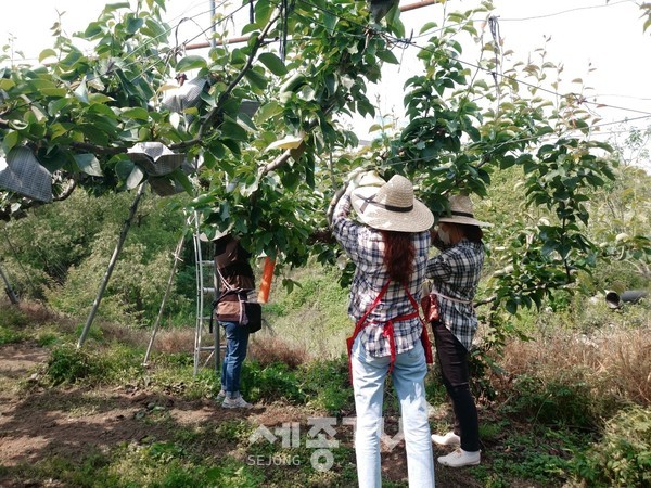 이번 일손돕기는 코로나19 장기화, 농촌지역 인구감소·고령화 등으로 외국인 노동자, 현장인력 확보가 어려워진 부강면 배 재배 농가의 영농 지원을 위해 진행됐다.