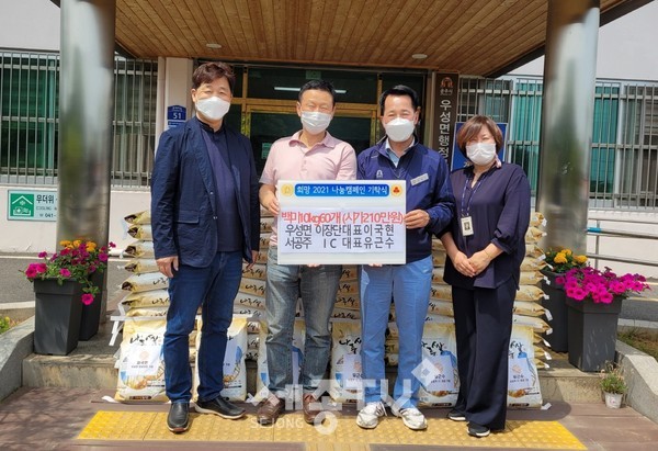 이국현 협의회장과 유근수 대표는 이날 우성면 행정복지센터를 찾아 210만 원 상당의 쌀 10kg 60포를 오동기 면장에게 전달했다.