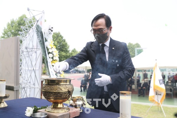 코로나19 지역 내 감염 방지를 위해 참석 규모를 축소한 가운데 열린 이날 행사는 박상돈 천안시장을 비롯한 유가족과 보훈단체장, 육군제9보병사단장 등 군부대, 추모회 등이 참석해 헌화 및 분향을 진행했다.