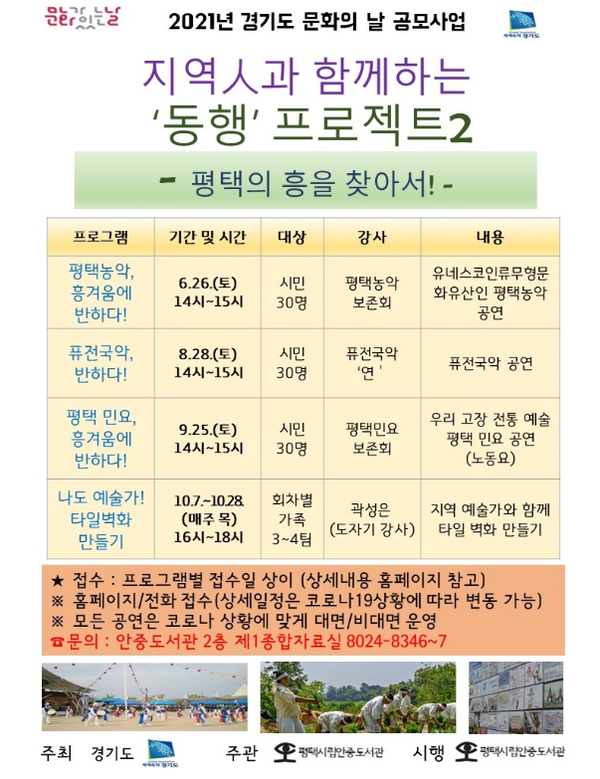 평택시립안중도서관은 경기도가 주최하고 안중도서관이 주관하는 공모사업 2021년 경기도 문화의 날 「지역인과 함께하는 ‘동행’ 프로젝트 2」를 계획하고 있다.