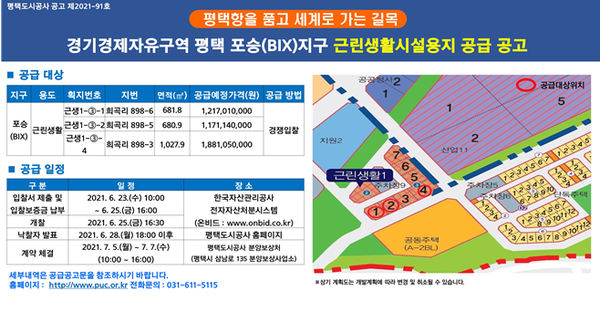 평택도시공사(사장 김재수)는 14일(월) 경기경제자유구역 평택 포승(BIX)지구 내 근린생활시설용지 3필지를 공급한다고 밝혔다.