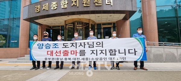 대전‧세종‧충남북의 소상공인 일동은 6월 14일 천안 소상공인시장진흥공단에서 지지선언을 발표하고 “소상공인의 든든한 대변인 역할을 실천해오고 있는 양승조 도지사를 적극 지지하며 양승조 도지사의 대선 승리를 위해 최선의 노력을 다하겠다”고 밝혔다. 이번 지지선언에는 대전과 세종, 충남북의 소상공인 130여 명이 참여했다.