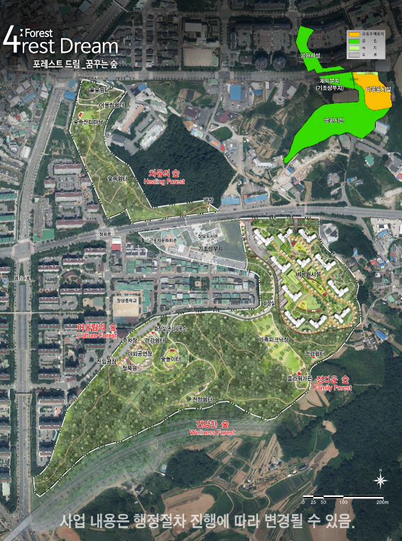 현재 1,140억 원을 투자해 보상절차가 마무리 단계에 있으며, 민간사업 총 면적은 25만5천㎡으로 5만5천㎡(22%)에 공동주택을 건설하고, 20만㎡(78%)에 공원을 조성해 평택시에 무상 기부채납하게 된다. 공사기간은 2022년부터 2024년까지이며, 숲속쉼터, 가족피크닉장, 플라워가든, 공연장 및 숲놀이터 등이 조성된다.