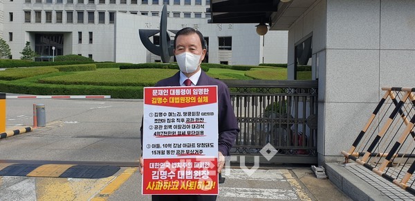 국민의힘 홍문표 국회의원(충남 예산·홍성군)은 16일 김명수 대법원장의 사퇴와 사법부의 정치 중립성을 촉구하는 1인 시위를 펼쳤다.