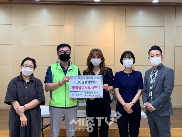 ㈜금강웰빙푸드(대표 김정순)은 17일 (재)대한성공회유지재단 쌍용종합사회복지관(차윤희 관장대행)과 주택관리공단 천안쌍용1관리소(김흥주 소장)에 마스크 4,000개를 전달했다.