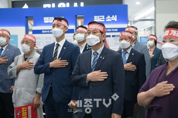 세종특별자치시 국가균형발전지원센터(센터장 김수현)는 23일 세종시청 1층 행정수도 완성 홍보전시관에서 ‘국회의사당 설치를 위한 국회법 개정’을 촉구하는 ‘세종시 민·관·정 결의대회’를 가졌다.