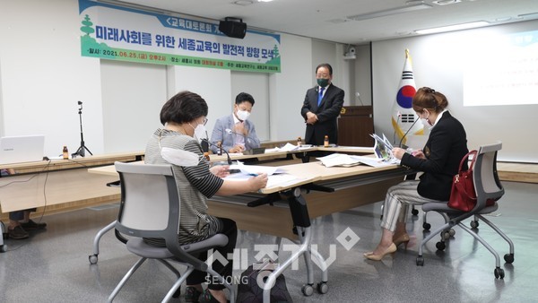 세종교육연구소와 세종교육내일포럼(대표 송명석)'에서는『미래사회를 위한 세종교육 발전적 방향 모색』이라는 제목으로 2021년 6월25일(금) 오후2시 세종시 의회 대회의실에서 발제자 - 송명석 박사(세종교육연구소장), 토론자1 -최수정 박사(부모교육 전문가), 토론자2 -권오열 박사(미래교육 전문가), 토론자3 -홍나영 원장(학교폭력 예방 전문가), 토론자4 -윤지성 회장(세종시학원연합회장)과 세종교육연구소 연구원들은 교육대토론회를 성황리에 실시했다.
