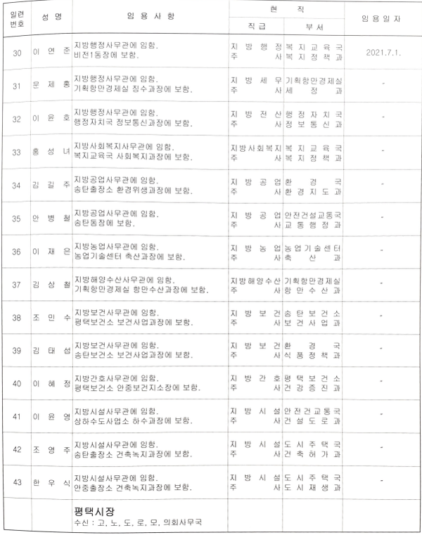 평택시,, 2021년 6월 25일 인사발령(5급 전보, 임용)