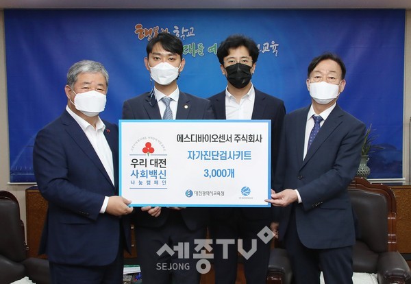 ㈜SD바이오센서 관계자는 “코로나19 위기상황에 학생 안전을 위해 총력을 다하는 대전교육청의 노고에 감사드리며, 자가검사키트 기부가 작지만 학생들에게 도움이 되었으면 좋겠다”며 “앞으로도 지역사회 학생들을 위한 다양한 교육기부 활동을 전개해 나가겠다.”고 밝혔다.