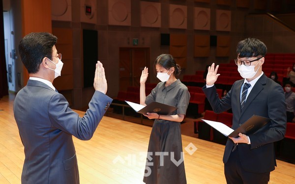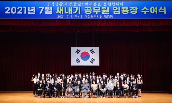 허태정 대전시장은 7월 1일, 코로나19 방역 조치 준수 하에 대전시 새내기 공직자 43명에게 임용장을 수여하고 “시민과 함께하는 대전시정의 중요성과 시민의 눈높이에서 공직생활에 임해줄 것”을 당부했다.