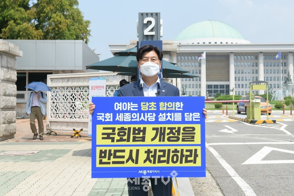 이춘희 세종특별자치시장은 1일 서울 여의도 국회 정문 앞에서 긴급 기자회견과 1인시위에 참석, 국회법의 조속한 처리를 촉구했다.