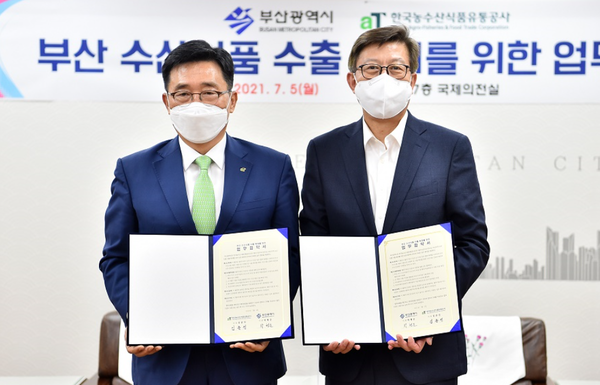 박형준 부산 시장와 한국농수산식품유통공사(사장 김춘진)가 코로나19 장기화와 역내포괄적경제동반자협정(RCEP) 등 수산식품 수출의 위기에 대응해 시장의 다변화 등을 추진하기 위해 힘을 모은다.