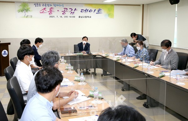충남고등학교(교장 최정수)는 7월 14일(수) 설동호 대전광역시교육감의 방문으로 충남고 교육 가족과 함께하는 ‘교육감과 함께 하는 소통·공감 데이트’ 시간을 가졌다고 밝혔다.