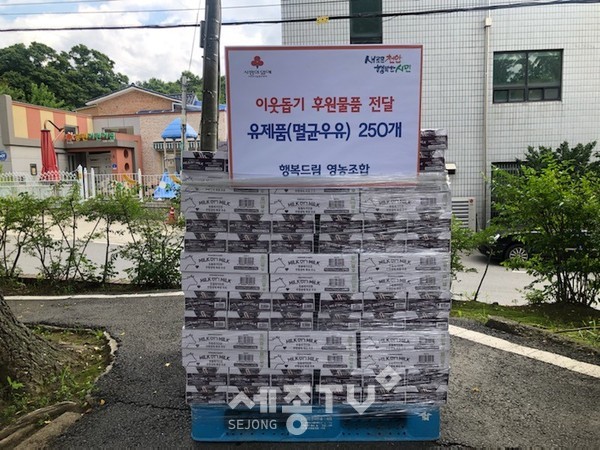 천안시 동면은 행복드림영농조합이 15일 지역 내 어려운 이웃을 위해 멸균우유 등 유제품 250개를 기탁했다고 밝혔다.
