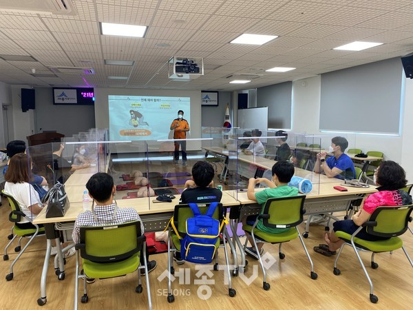 지난 달 어린이 대상 1차 교육에 이어 가족단위 신청자를 대상으로 실시한 이번 교육의 주요 내용은 ▲ 세종소방서 예방안전과 대원의 응급 처치 이론 및 실습 ▲익수자 구조 방법 ▲배 전복 시 탈출 방법 ▲ 구명조끼 착용 및 이동 방법 등이다.