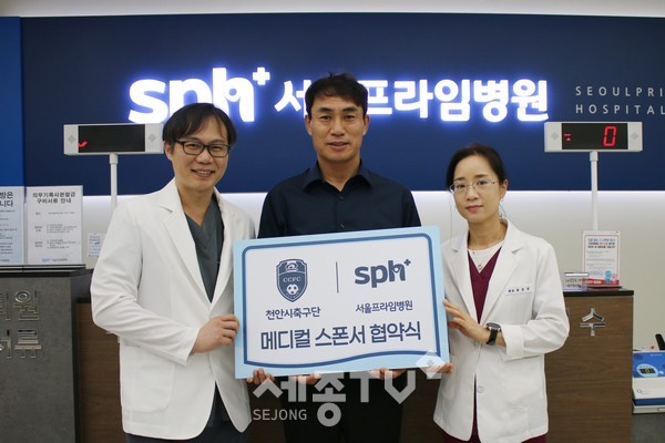 천안시축구단이 서울프라임병원(천안점대표원장 홍성원)과 메디컬 스폰서 협약을 맺었다. 협약식은 김태영 감독과 홍성원 대표원장, 원은영 원장이 참석한 가운데 3일 오전 9시 서울프라임병원 천안점에서 진행됐다.