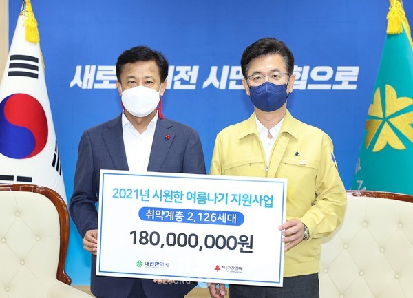 허태정(오른쪽) 대전시장은 5일 대전사회복지공동모금회장으로부터 코로나19 및 폭염 등으로 도움이 필요한 지역 저소득가정에게 시원한 여름을 지낼 수 있도록 현금 및 물품(총 1억 8000만 원 상당)을 지정 전달 받았다.