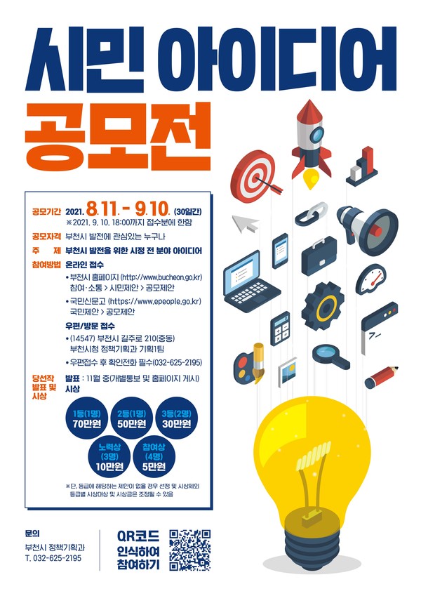 부천시(시장 장덕천)는 창의적인 아이디어를 발굴하여 정책을 고도화하고 시민 참여 행정을 실현하고자‘2021년 하반기 시민‧공무원 아이디어 공모전’을 개최한다.